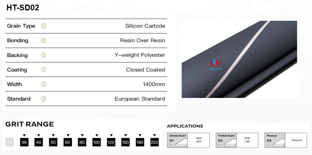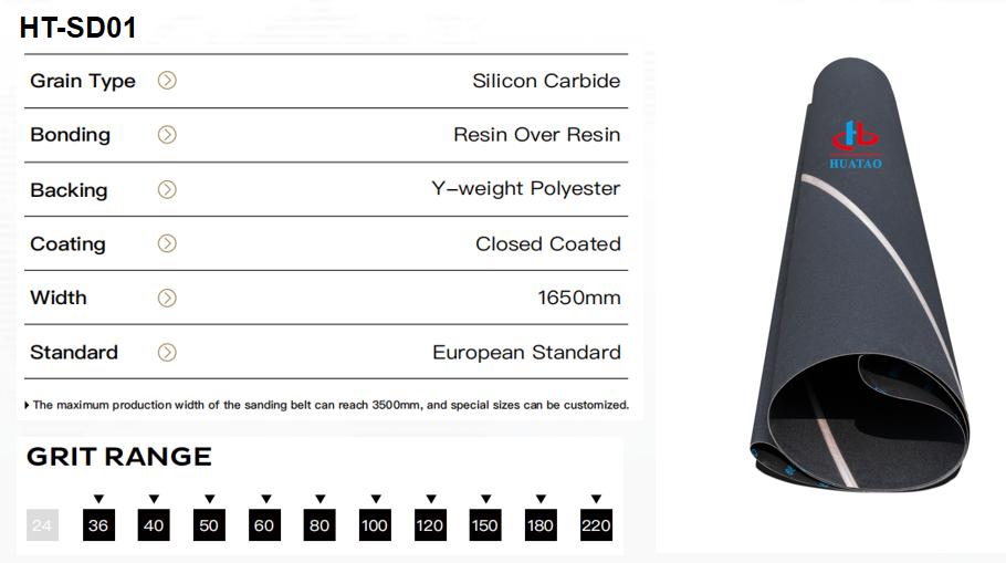 The grain type of HUATAO abrasives belts is Silicon carbide, which have good grinding performance and are suitable for a variety of artificial board materials. The belt backing is Polyester cloth, which with very high strength and small elongation; it is extremely suitable for making high-speed, heavy-duty, wide and large abrasive belts.